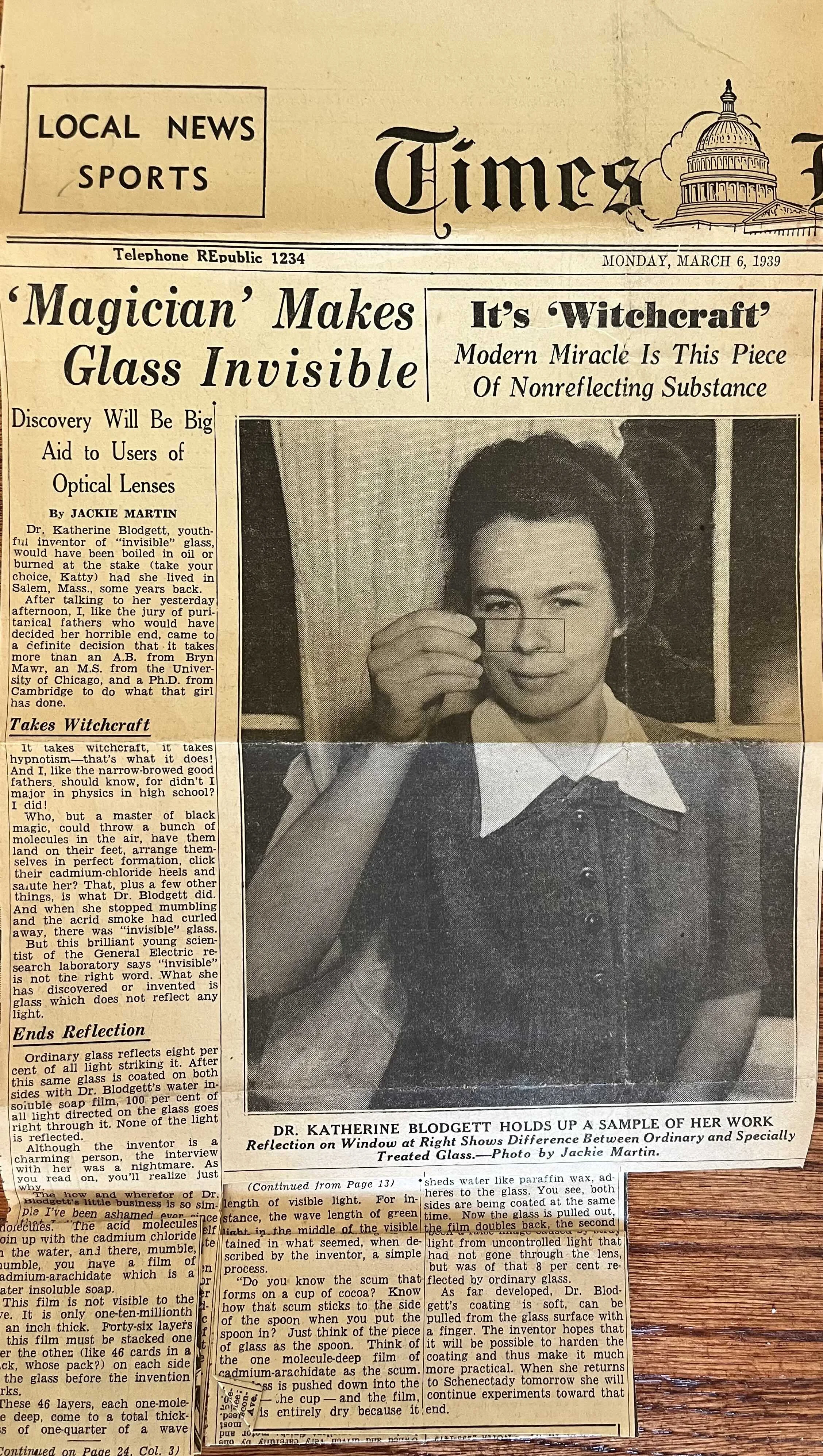 The article called her discovery ‘invisible glass”, which we know irked Katharine because it is not really accurate. She was right, of course. Glass itself is not invisible, her films just cut out the glare. Several years later, Katharine corrected a reporter from the Associated Press on exactly this point: “Dr. Blodgett frowns on the phrase invisible glass,” the piece read. She always says, "Non-reflecting.”